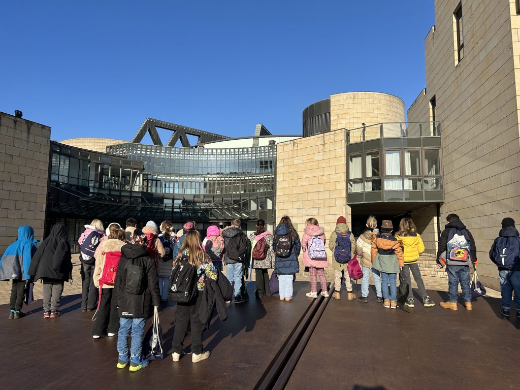 Am 21.11.25 um 7.30 Uhr sind wir mit einem Reisebus zum Landtag nach Düsseldorf gefahren. Die Fahrt dauerte 90 Minuten. Als wir angekommen waren, haben wir direkt am Haupteingang geparkt und mussten dann durch eine Sicherheitskontrolle. Dann sind wir zum Plenarsaal gegangen. Wir haben uns auf die Plätze der Abgeordneten gesetzt. Ein Mädchen wurde zur Präsidentin gewählt und sollte die Sitzung leiten. Nun haben wir diskutiert, ob „Tanzen“ ein Schulfach werden sollte. Ungefähr die Hälfte der Kinder war dafür und die andere Hälfte dagegen. Als wir fertig waren mit der Abstimmung, sind wir zum Frühstücken in die Kantine gegangen. Es gab belegte Brötchen, Actimel, Schokomuffins und Orangensaft. Danach haben wir den Vizepräsidenten Christof Rasche getroffen. Er ist von der FDP. Wir durften ihm persönliche und politische Fragen stellen. Nach der Fragerunde haben wir noch Fotos mit ihm gemacht. Nach den Fotos hat noch jedes Kind einen Beutel vom Landtag bekommen mit einem Malbuch, Pixibuch und Gummibärchen. Dann sind wir nach Hause gefahren.